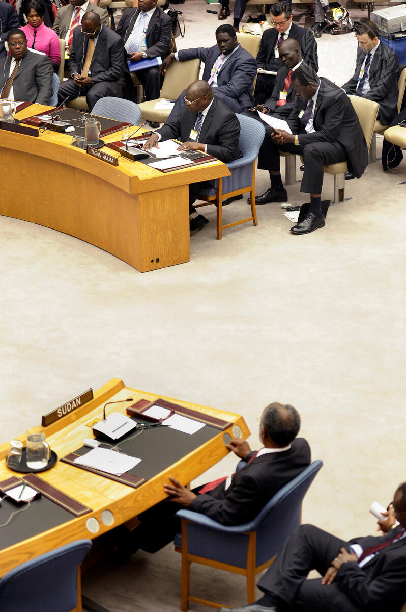 A view inside the Security Council Chamber as Pagan Amum (top), Secretary General of the Sudan People’s Liberation Movement (SPLM), addresses a Council high-level meeting on Sudan and the country's upcoming referenda. Pictured below is Ali Ahmed Karti, Minister for Foreign Affairs of the Republic of the Sudan.