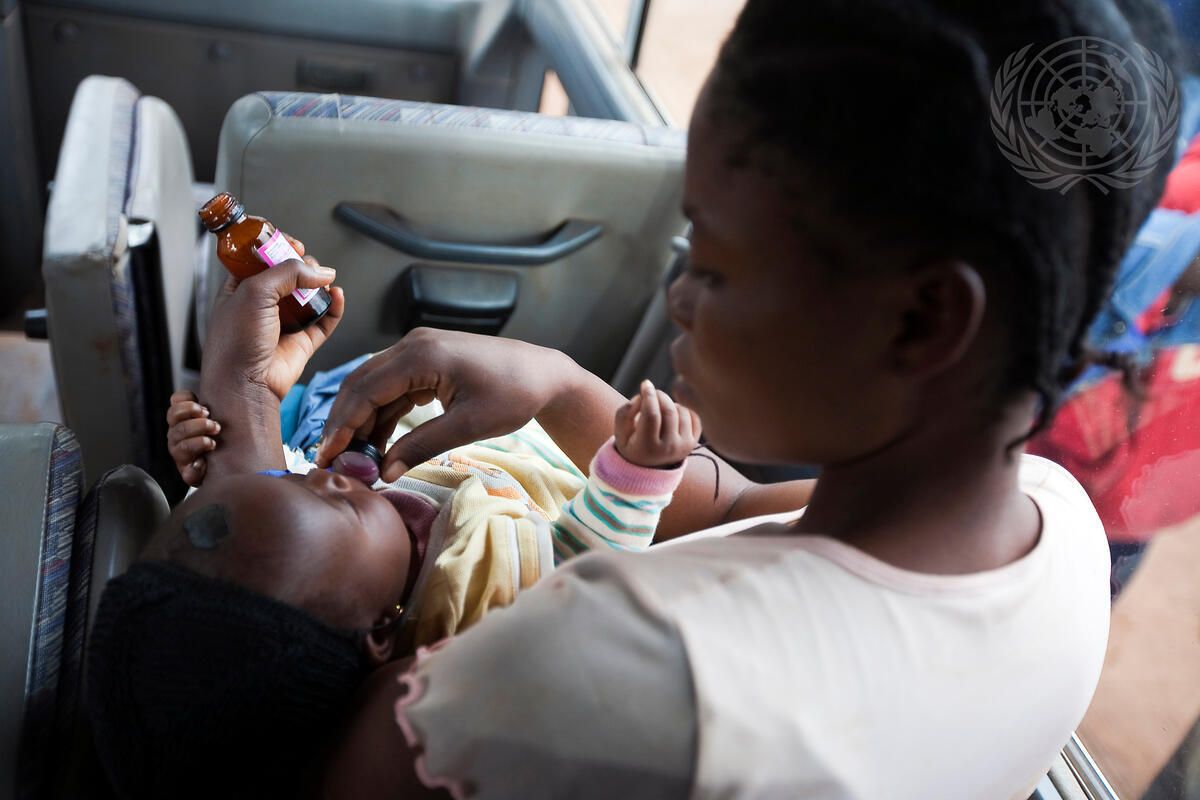 A mother feeds medicine to her newborn child on a convoy of refugees being repatriated to the Democratic Republic of the Congo (DRC). The mother is among 173 Congolese who boarded trucks, or buses and ambulances for the elderly, infirm and those with infants, at a transit camp in Songore, Burundi, for voluntary repatriation.