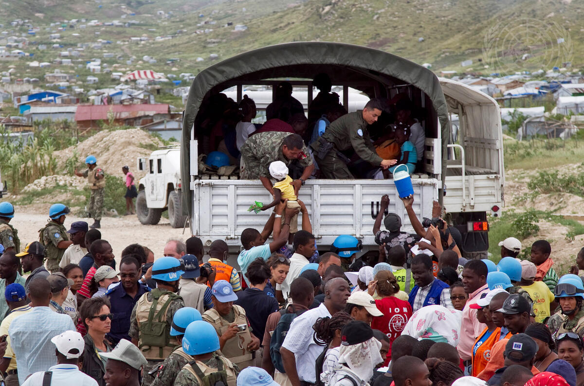A UN peacekeeper helps a child aboard a truck during the relocation of residents of a tent camp, displaced since the devastating January 2010 earthquake, in Port-au-Prince, Haiti. In preparation of approaching Hurricane Tomas, the United Nations Stabilization Mission in Haiti (MINUSTAH) and the International Organization for Migration are moving the camp residents to a more secure location.