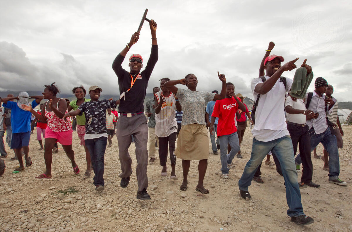 Residents of a tent camp in Port-au-Prince, Haiti, where many are still living following the January 2010 earthquake, chant and demonstrate during a relocation plan by the UN mission in Haiti (MINUSTAH) and the International Organization for Migration (IOM). In preparation of approaching Hurricane Tomas, the organizations are moving the residents of the camp to a more secure location.