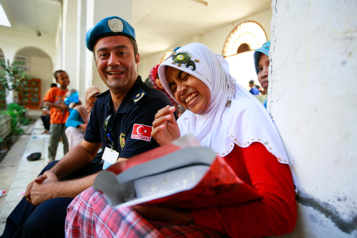 Turkish UN Police (UNPOL) officer Hakan Arslan shares a laugh with a girl at Dili Mosque Orphanage, Timor-Leste. The Turkish UNPOL contingent donated gifts to the orphanage, where 49 boys and 38 girls are housed, in a ceremony attended by Luis Miguel Carrilho, UNPOL Commissioner for the UN Integrated Mission in Timor-Leste (UNMIT).