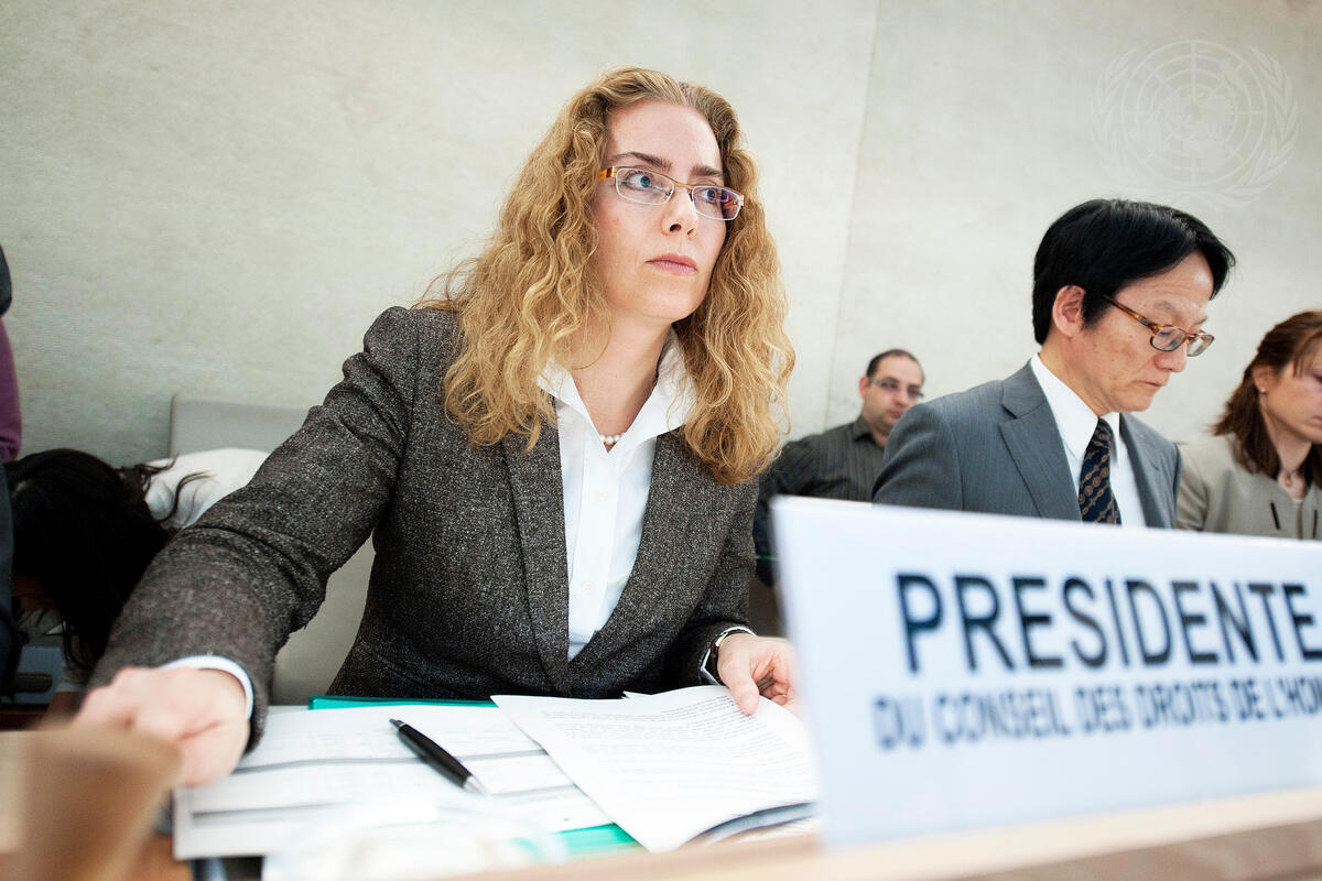 The President of the Human Rights Council, Laura Dupuy Lasserre, opens a session of the Council on Sri Lanka, at which Members adopted a resolution urging the country to investigate potential human rights abuses committed during its 26-year-long civil war – by a vote of 24 in favour, 15 against and 8 abstentions.