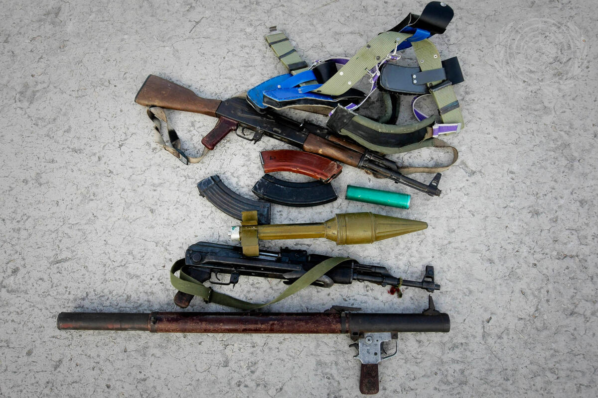 A view of the weapons seized from four suspected members of Al Shabaab, the Islamic insurgent group, in Mogadishu, Somalia. The militants were captured during a joint security operation by soldiers of the African Union Mission in Somalia (AMISOM) and Somali security services in the areas of Torfiq and Yaaqshiid. The men, all in their mid-twenties, were found in possession of a rocket-propelled grenade, two sub-machine guns and 84 rounds of ammunition.