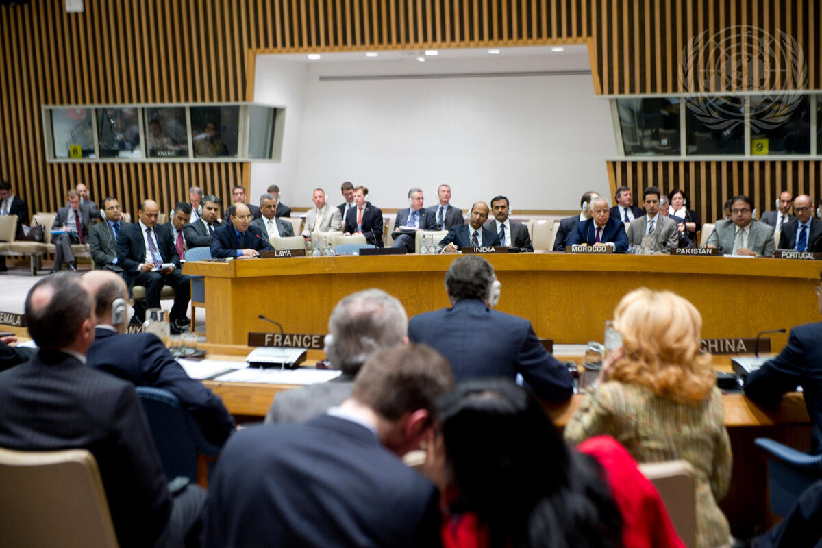 A partial view of the Security Council as Ibrahim O. A. Dabbashi (at Council table, left), the Deputy Permanent Representative of Libya to the UN, addresses a meeting on his country. By the adoption of resolution 2040 (2012), Council Members unanimously decided to extend the mandate of the UN Support Mission in Libya (UNSMIL) for one year.