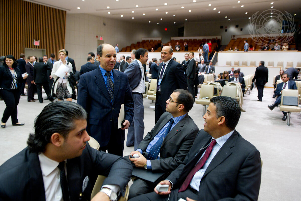 Ibrahim O. A. Dabbashi (standing centre), Deputy Permanent Representative of Libya to the UN, chats with colleagues inside the Security Council Chamber prior to a meeting on his country. At the meeting Members of the Council unanimously adopted resolution 2040 (2012), extending the mandate of the UN Support Mission in Libya (UNSMIL) by one year.