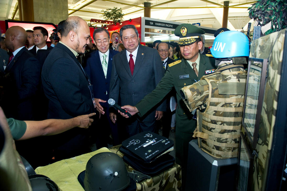 Secretary-General Ban Ki-moon (centre left, in green tie) and Indonesian President Susilo Bambang Yudhoyono (right of Mr. Ban), walk through a defence-themed exhibit at the Jakarta International Defense Conference.