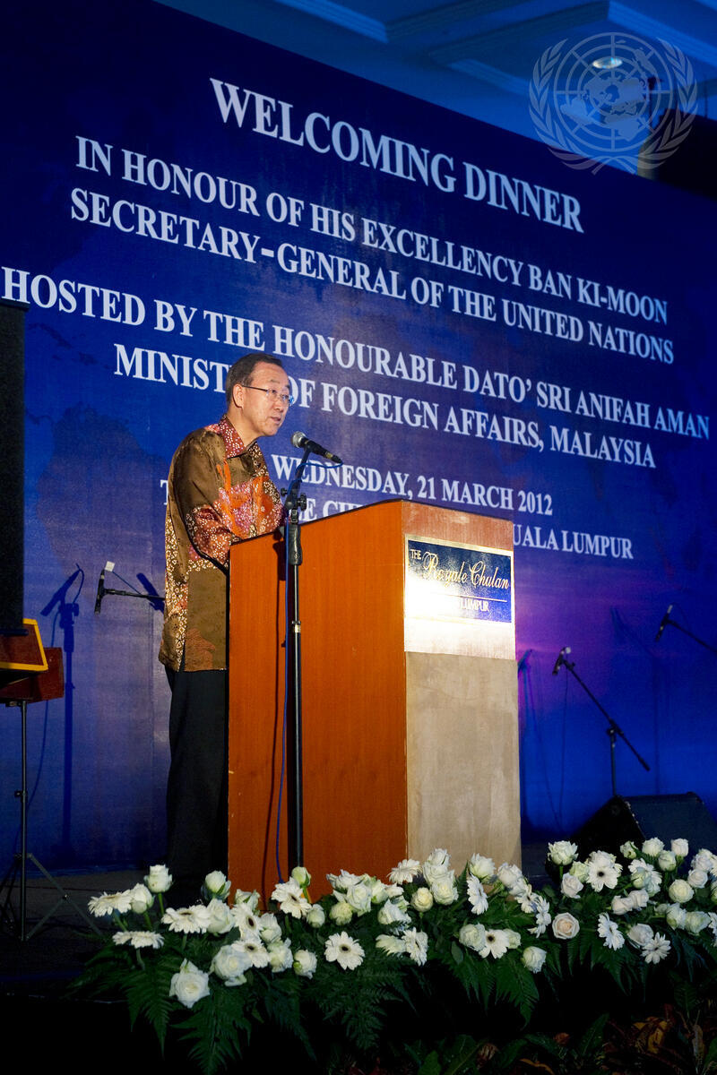 Secretary-General Ban Ki-moon speaks at the dinner held in his honour by Malaysian Foreign Minister, Dato Sri Anifah Aman, in Kuala Lumpur.