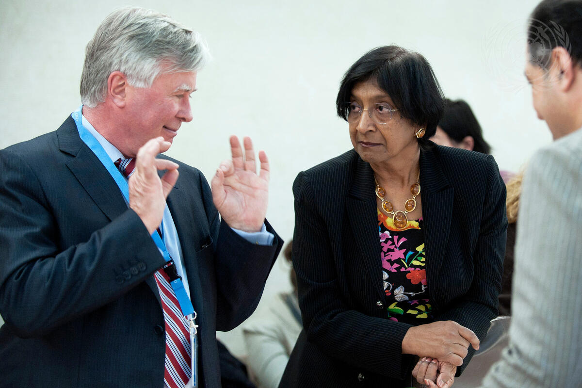 Judge Philippe Kirsch (left), Chair of the Commission of Inquiry on Libya, a group appointed by the Human Rights Council, speaks with High Commissioner for Human Rights Navi Pillay, before briefing the Council on the Commission’s findings.