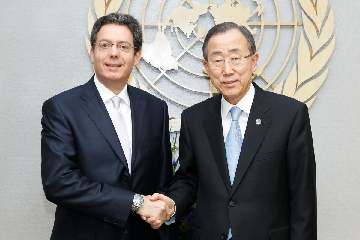 Minas A. Hadjimichael (left), outgoing Permanent Representative of the Republic of Cyprus to the UN, pays a farewell call on Secretary-General Ban Ki-moon.