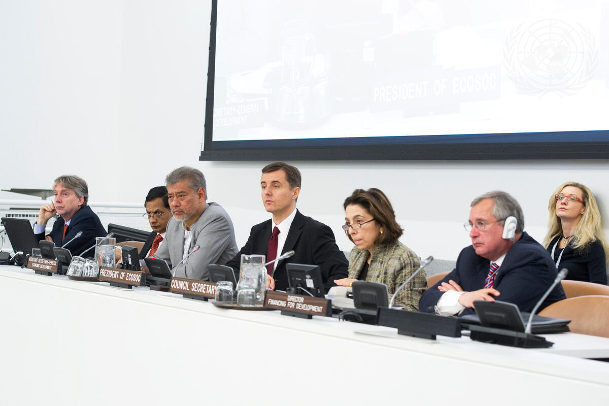 Miloš Koterec (third from right), Permanent Representative of Slovakia to the UN and President of the Economic and Social Council (ECOSOC), chairs the Council’s special high-level meeting on promoting economic growth, job creation and financing for sustainable development, with the Bretton Woods institutions, the World Trade Organization (WTO) and the UN Conference on Trade and Development (UNCTAD). Pictured with Mr. Koterec (from left): Robert Vos, Director of the Development Policy and Analysis Division of the Department of Economic and Social Affairs (DESA); Shishir Priyadarshi, Director of the Development Division at WTO; and Jomo Kwame Sundaram, Assistant-Secretary-General for Economic Development.