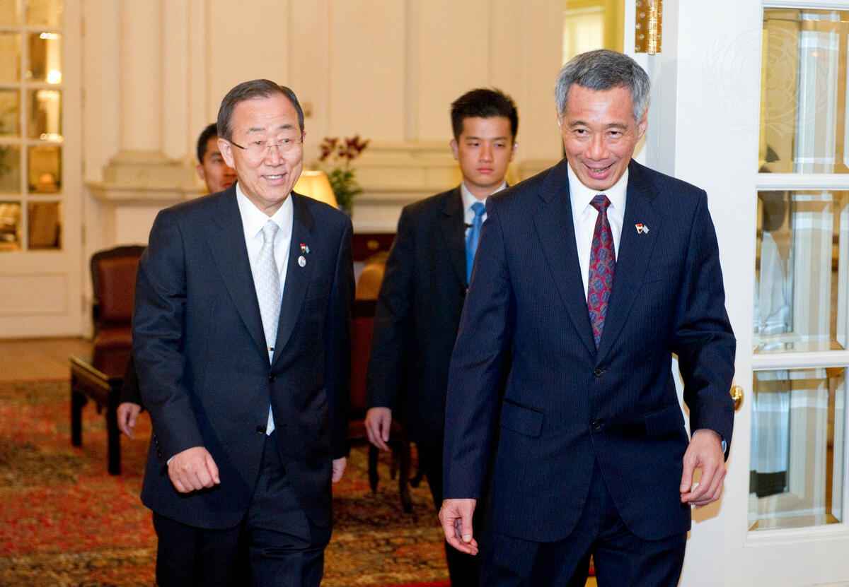Secretary-General Ban Ki-moon (left) and Lee Hsien Loong, Prime Minister of the Republic of Singapore, are shown on the way to their meeting at the Prime Minister’s Office.