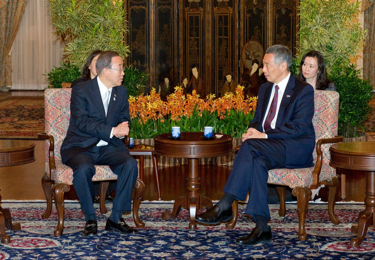 Secretary-General Ban Ki-moon (left) meets with Lee Hsien Loong, Prime Minister of the Republic of Singapore.