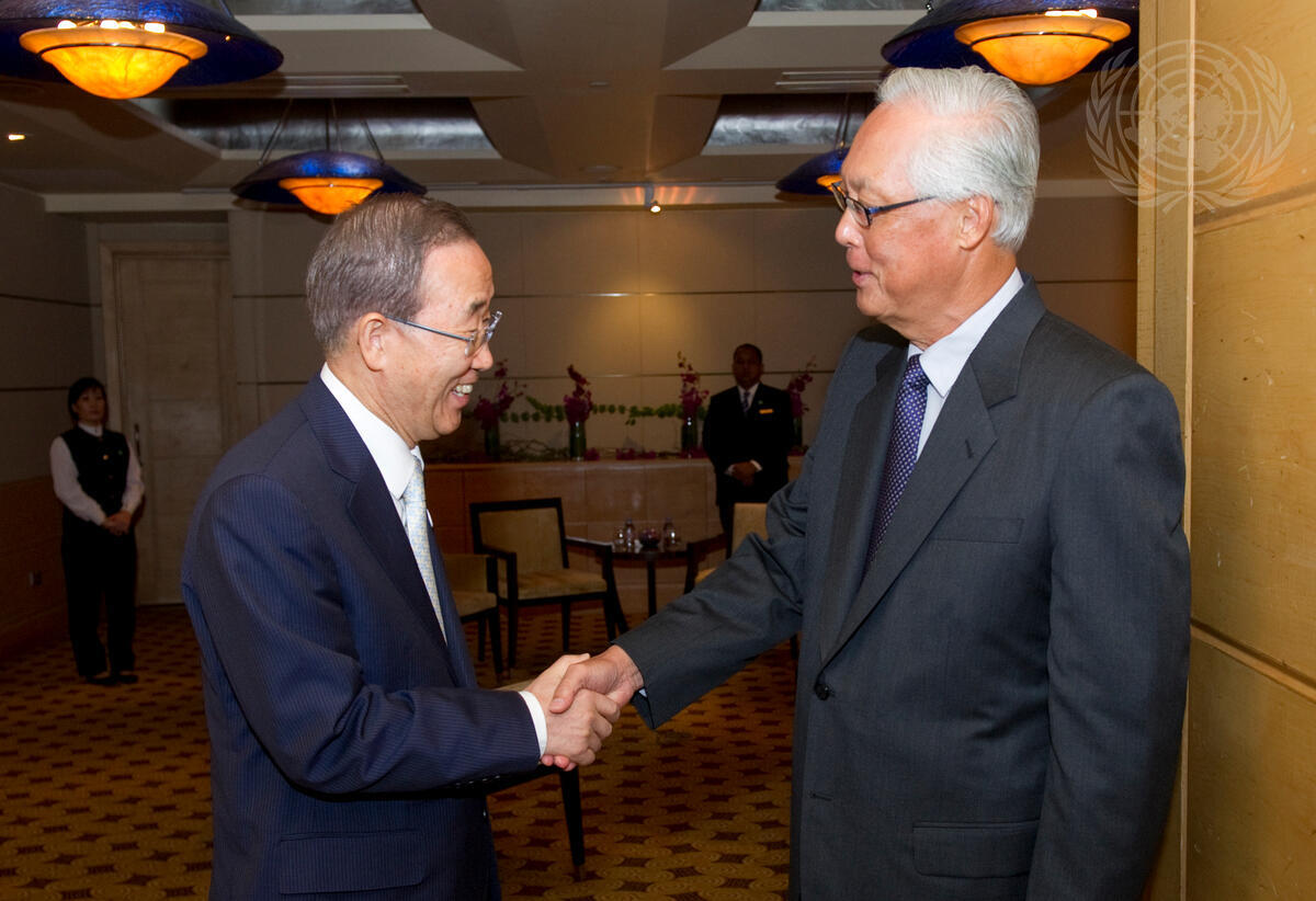 Secretary-General Ban Ki-moon (left) meets with Goh Chok Tong, Emeritus Senior Minister and Senior Adviser to the Monetary Authority of Singapore (MAS), in Singapore.