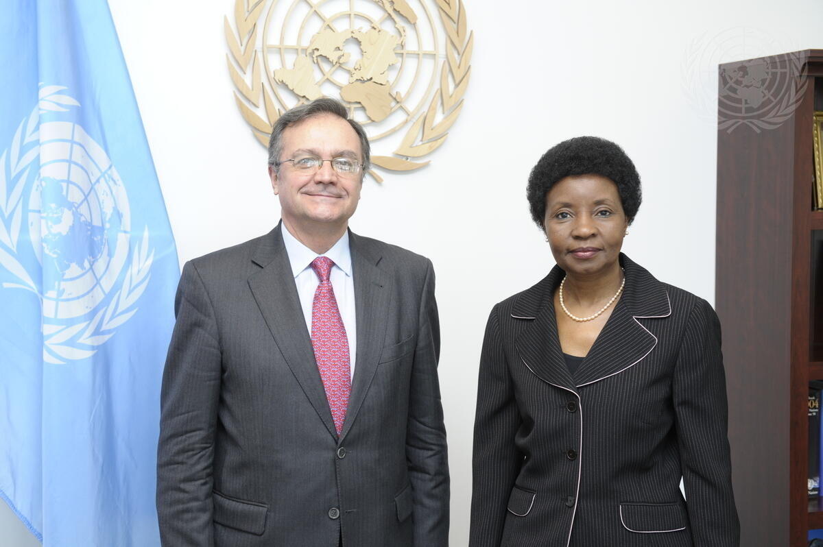 Juan Pablo de Laiglesia (left), outgoing Permanent Representative of Spain to the UN, pays a farewell call on Deputy Secretary-General Asha-Rose Migiro.