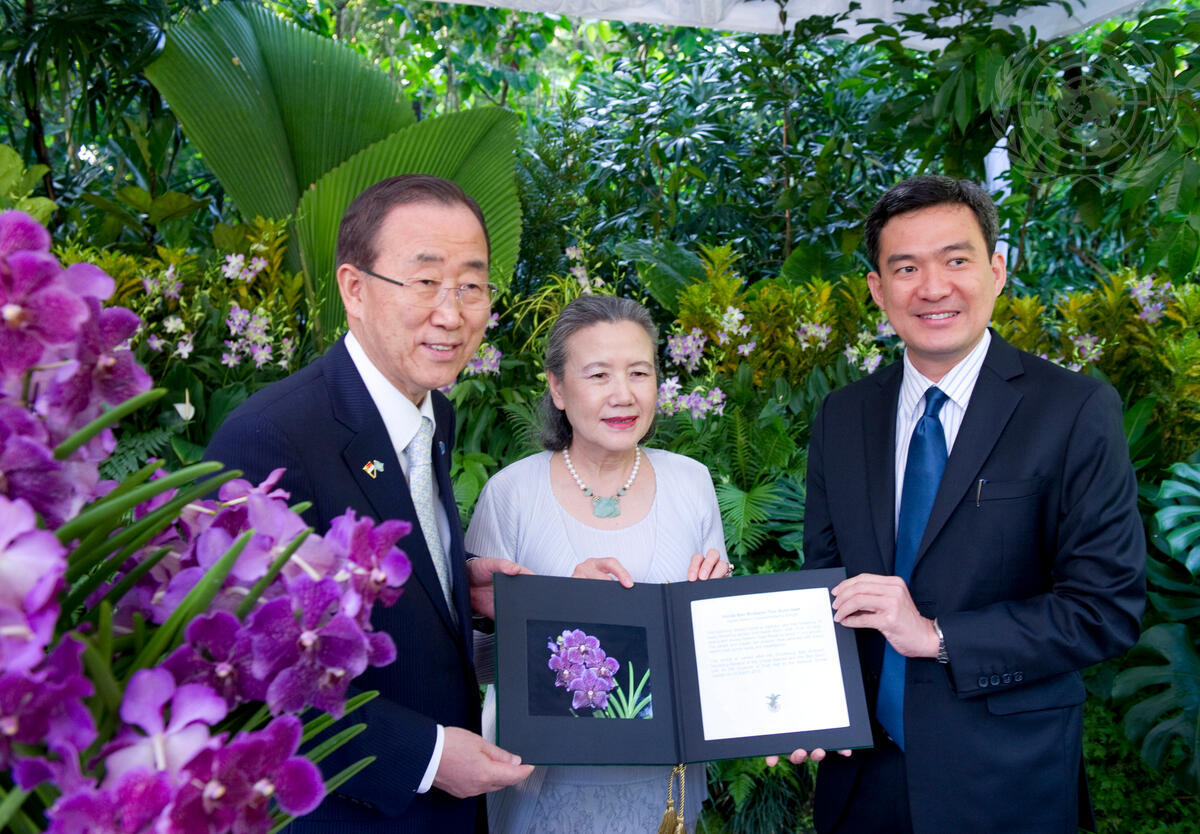 Secretary-General Ban Ki-moon (left) and his wife, Yoo Soon-taek, hold up the official certificate of the orchid named in their honour, the “Vanda Ban Ki-moon Yoo Soon-taek”, at the Singapore National Orchid Garden.