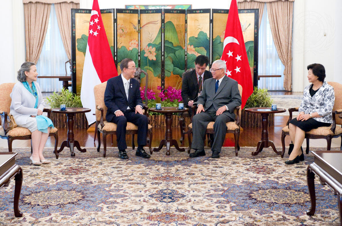 Secretary-General Ban Ki-moon (centre left) and Tony Tan Keng Yam (centre right), President of the Republic of Singapore, meet at the President’s Office alongside their wives, Yoo Soon-taek (left), and Mary Chee Bee Kiang.