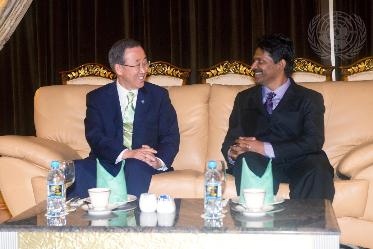 Secretary-General Ban Ki-moon (left) is met by Kohilan Pillay, Deputy Minister for Foreign Affairs, upon arrival in Kuala Lumpur, Malaysia.