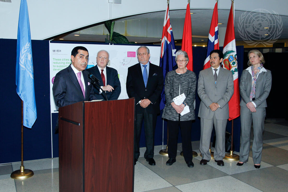 Nassir Abdulaziz Al-Nasser (at podium), President of the sixty-sixth session of the General Assembly, speaks at the opening of an exhibit at UN Headquarters on reducing disaster risk to support sustainable development. Pictured third from right is Margareta Wahlström, Special Representative of the Secretary-General for Disaster Risk Reduction.