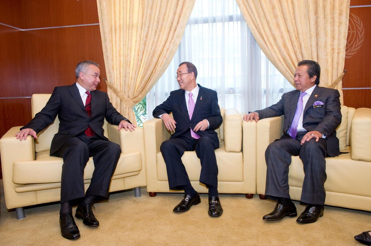 Secretary-General Ban Ki-moon (centre) meets with Raja Doctor Nasrin ShahIbni Sultan Asllan Muhibbubbim (left), Raja Muda (Crown Prince) of the Malaysian state of Perak, and Dato Sri Anifah Aman, Minister for Foreign Affairs of Malaysia, before delivering a lecture at the Institute for Diplomacy and Foreign Relations (IDFR) in Kuala Lumpur.