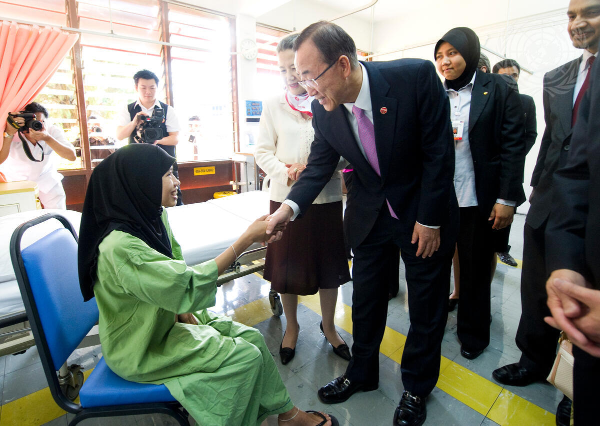 Secretary-General Ban Ki-moon (in purple tie) and his wife, Yoo Soon-taek (left of Mr. Ban), meet a tuberculosis (TB) patient during their visit to the Institute of Respiratory Medicine in Kuala Lumpur, Malaysia. Accompanied by the Malaysian Minister of Health, they toured the facility ahead of World Tuberculosis Day on 24 March.