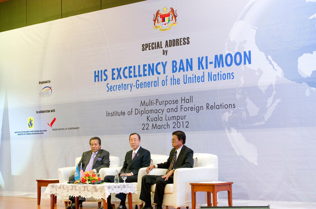 Secretary-General Ban Ki-moon (centre) sits on stage at the Institute for Diplomacy and Foreign Relations (IDFR) before delivering his lecture, “Malaysia and the United Nations in a Changing World”. He is flanked by Dato Sri Anifah Aman, Malaysian Minister for Foreign Affairs, and Tan Sri Razali Ismail, Chair of the Global Movement of Moderates Foundation and former President of the UN General Assembly.