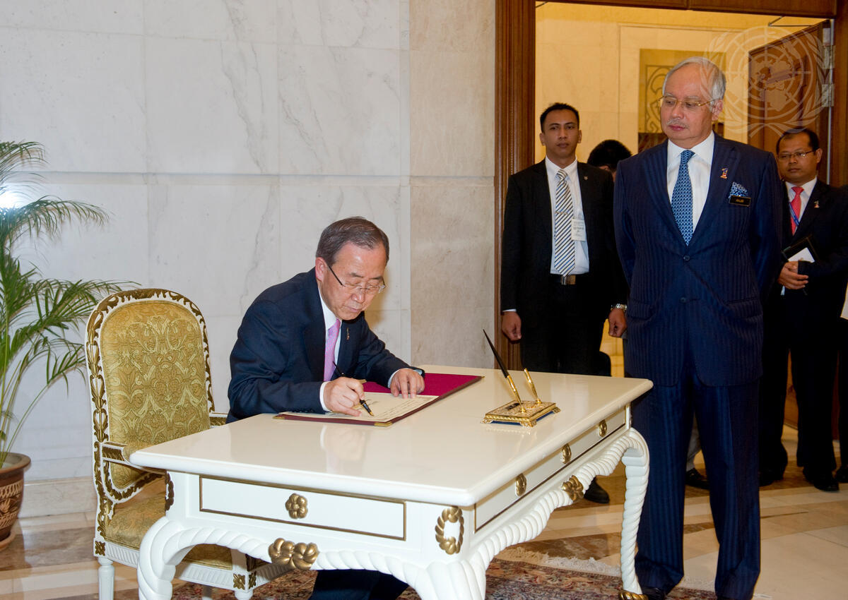 Secretary-General Ban Ki-moon signs the guestbook at the Office of the Prime Minister of Malaysia, as he arrives for a meeting with Prime Minister Dato’ Sri Mohd Najib bin Tun Haji Abdul Razak (right).