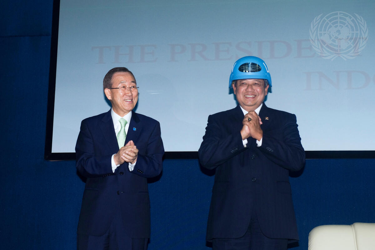 Secretary-General Ban Ki-moon (left) presents Susilo Bambang Yudhoyono, President of Indonesia, with an inscribed UN Ballistic Blue Helmet at the Indonesia Peace and Security Centre, where Mr. Ban delivered a lecture on UN peacekeeping.