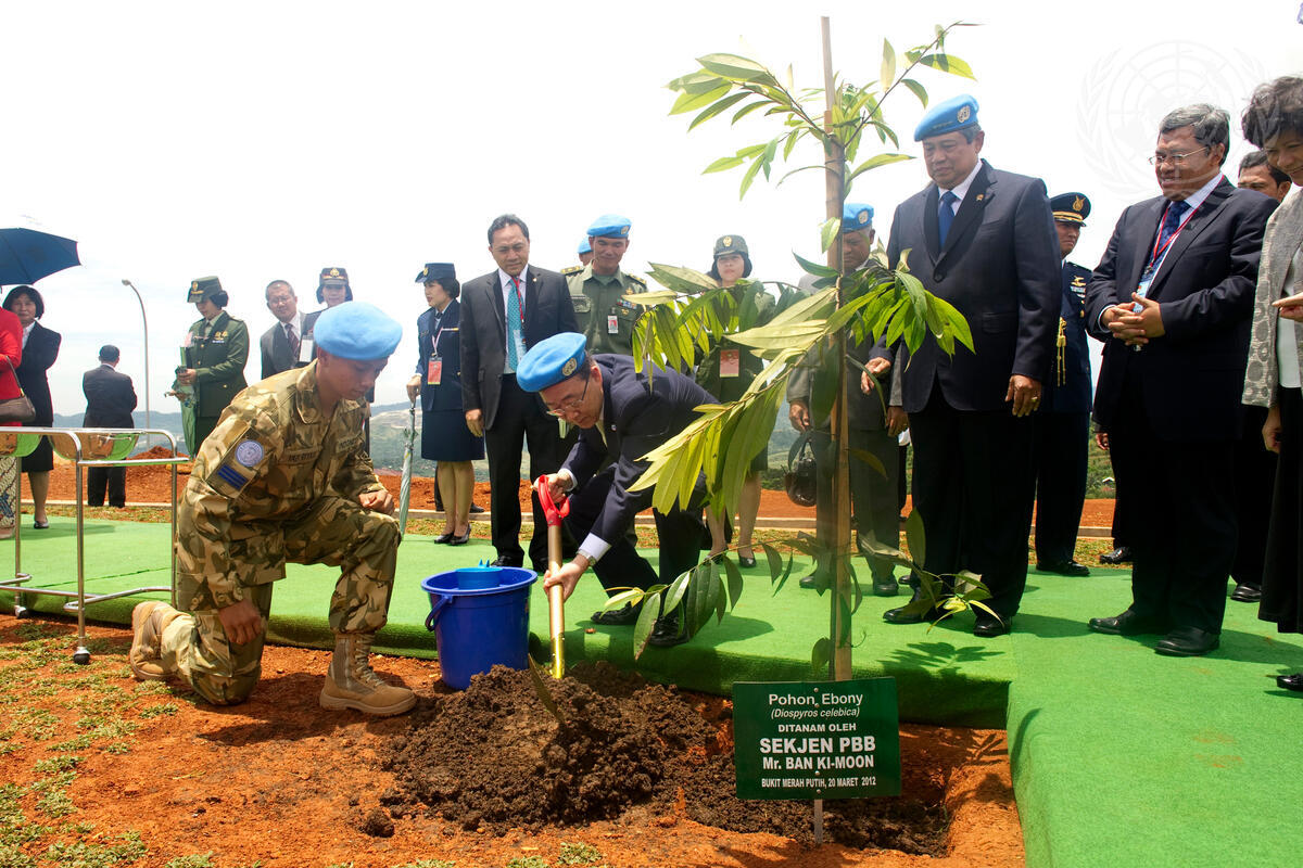 Secretary-General Ban Ki-moon (centre, crouching) plants a commemorative tree at the Indonesia Peace and Security Centre in Jakarta, beside Indonesian President Susilo Bambang Yudhoyono (standing right of Mr. Ban).