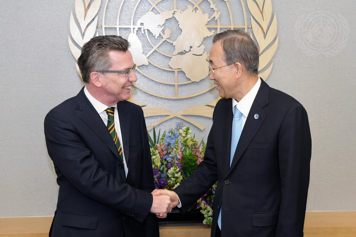 Secretary-General Ban Ki-moon (right) meets with Thomas de Maizière, Federal Minister of Defense of Germany.