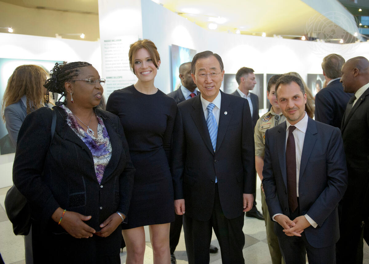 Secretary-General Ban Ki-moon (third from left) poses for a photograph at the ""Champions against Malaria"" exhibition. From left to right: Awa Marie Coll-Seck, Executive Director of the Roll Back Malaria Partnership; actress and singer Mandy Moore; Secretary-General; and Rick Reilly, columnist of Sports Illustrated.