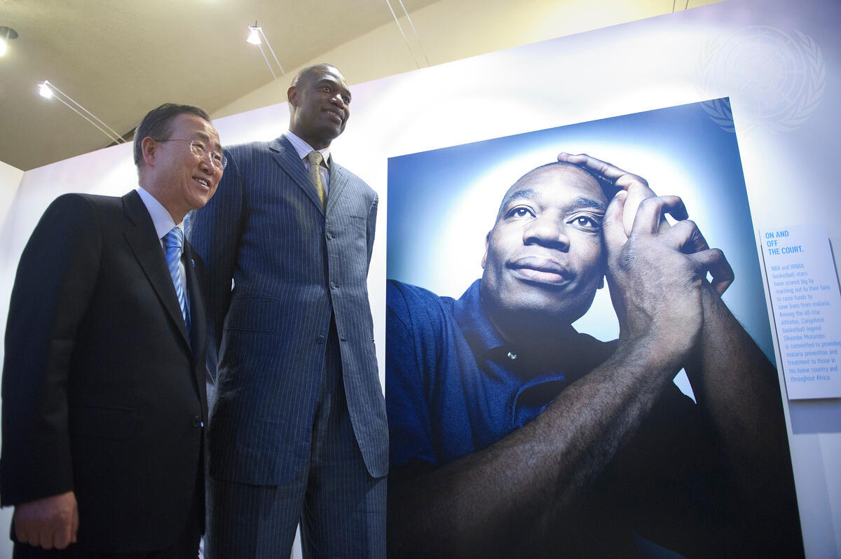 Caption Description Secretary-General Ban Ki-moon (left) poses for a photograph with retired basketball pro Dikembe Mutombo beside Mr. Mutombo’s portrait, one of several featured at the opening of the “Champions against Malaria” exhibit celebrating World Malaria Day, at UN Headquarters.