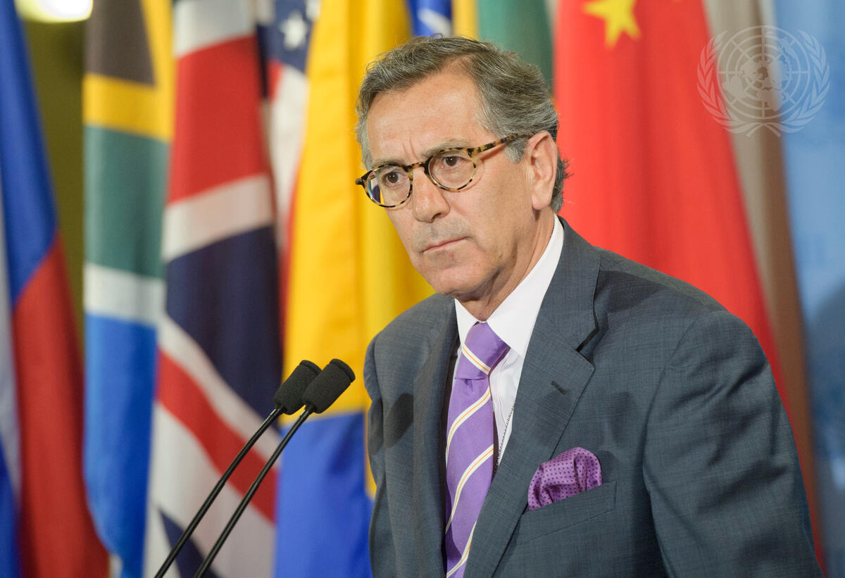 Néstor Osorio, Permanent Representative of Colombia to the UN and President of the Security Council for April, speaks to reporters following Secretary-General Ban Ki-moon’s briefing to the Council on his recent trips to Egypt, Qatar and Eastern Europe, and on the situation in North Africa and the Middle East. Mr. Osorio informed the press the Council would hold a more extensive meeting tomorrow on Syria where violent crackdowns on anti-government protests have increased over the last week.