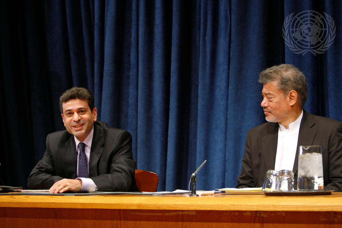 Amr Nour (left), Director of the UN Regional Commissions New York Office, and Jomo Kwame Sundaram, Assistant-Secretary-General for Economic Development, brief correspondents on the newly-launched 2011 flagship report of the UN Economic and Social Commission for Asia and the Pacific (ESCAP), entitled “Economic and Social Survey of Asia and the Pacific"".