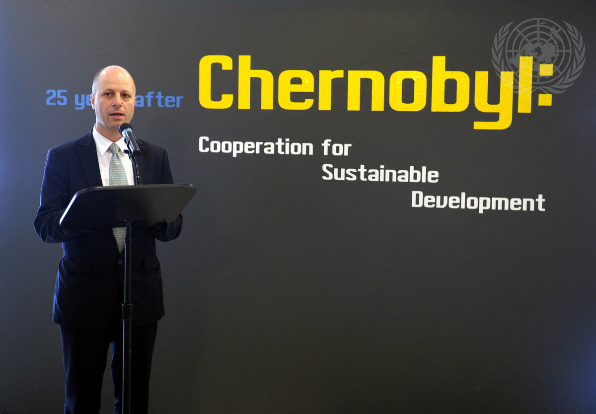 Maher Nasser, Director of the UN Department of Public Information’s Outreach Division, delivers introductory remarks at the opening of the photo exhibit, ”25 Years after Chernobyl: Cooperation for Sustainable Development”, at UN Headquarters.