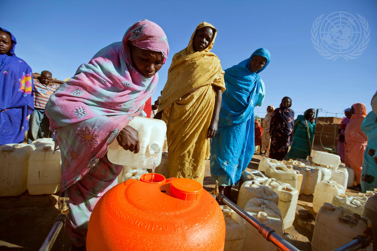 Women filling an orange Water Roller at a water distribution point in the Abu Shouk Camp for internally displaced people.