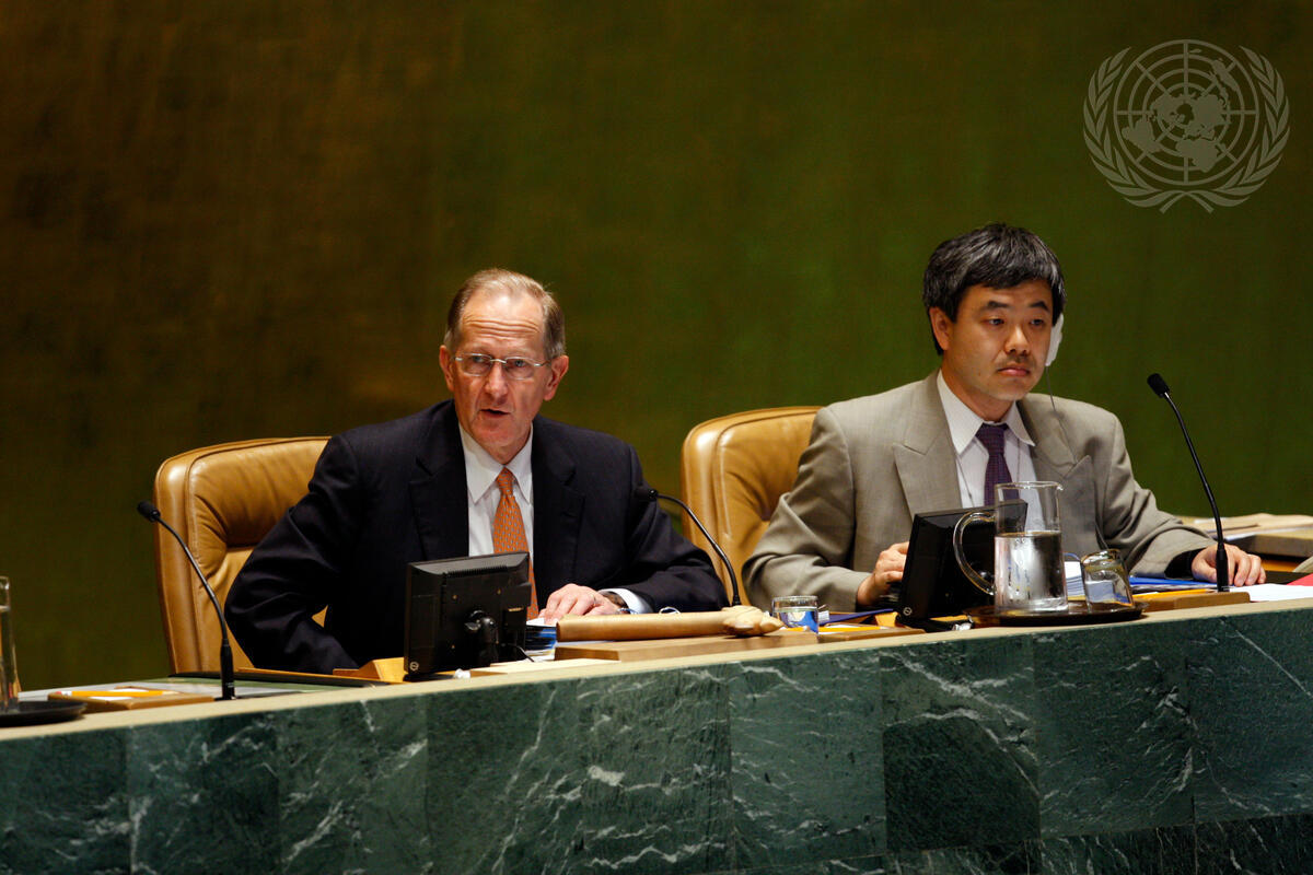 Joseph Deiss (left), President of the sixty-fifth session of the General Assembly, chairs the meeting. Kenji Nakano, Senior Political Affairs Officer of the General Assembly Affairs Branch of the Department for General Assembly and Conference Management, is on the right.