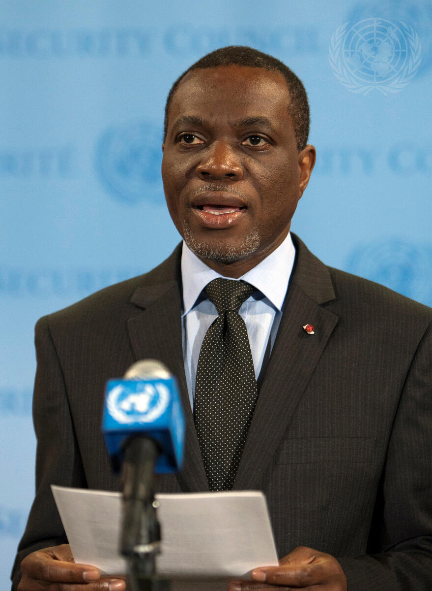 Nelson Messone, Permanent Representative of Gabon to the United Nations and President of the Security Council for June 2011, speaks to the press. The Council issued a press statement stressing the need for the authorities of Guinea-Bissau to intensify efforts to create the enabling environment for enhanced civilian control over the security forces of Guinea-Bissau, in particular the armed forces, and to make progress on security-sector reform.