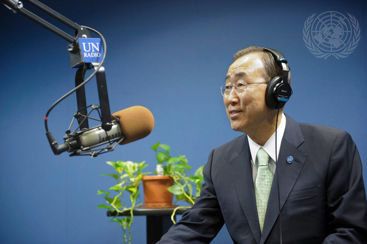 Secretary-General Ban Ki-moon is interviewed via telephone by National Public Radio (NPR) inside one of UN Headquarters' radio studios.