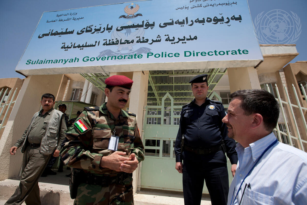 Cesar Zorzenon (right), Training Adviser on Standing Police Capacity of the United Nations Assistance Mission for Iraq (UNAMI) speaks to officers at the Sulaimanyah Governorate Police Directorate during his visit there.