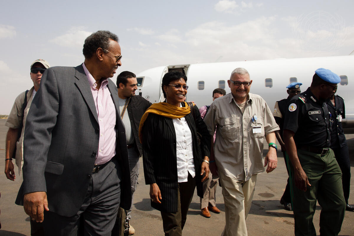 Aïchatou Mindaoudou Souleymane (centre), Deputy Joint Special Representative for Political Affairs in the African Union-United Nations Hybrid Operation in Darfur (UNAMID), arrives at El Fasher, North Darfur.