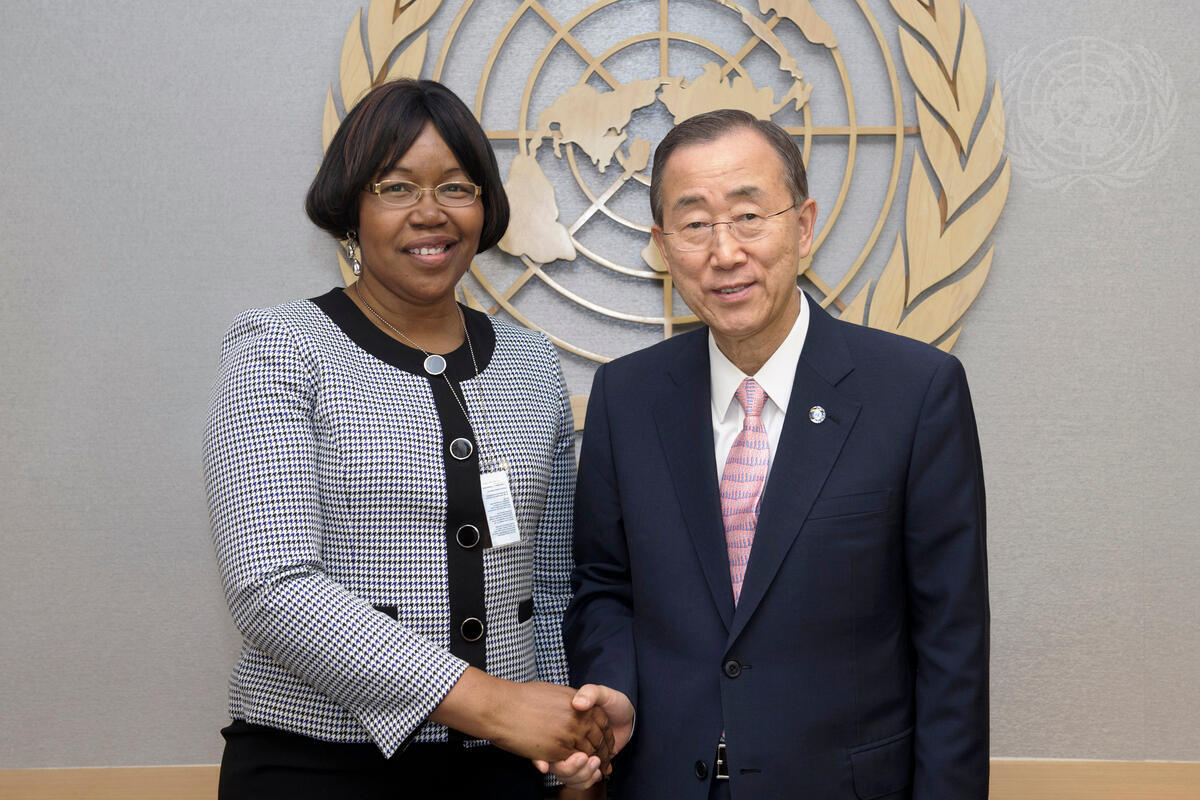 Secretary-General Ban Ki-moon (right) poses for a photograph with Nkemdilim Amelia Izuako, Judge of the UN Dispute Tribunal (UNDT), during the reception given for the judges of the Tribunal. UNDT is part of the new system of administration of justice that came into being on 1 July 2009. The Tribunal has jurisdiction to decide on appeals filed by staff members against administrative decisions alleged to be in non-compliance with their terms of appointment or contracts of employment, as well as administrative decisions imposing disciplinary measures.