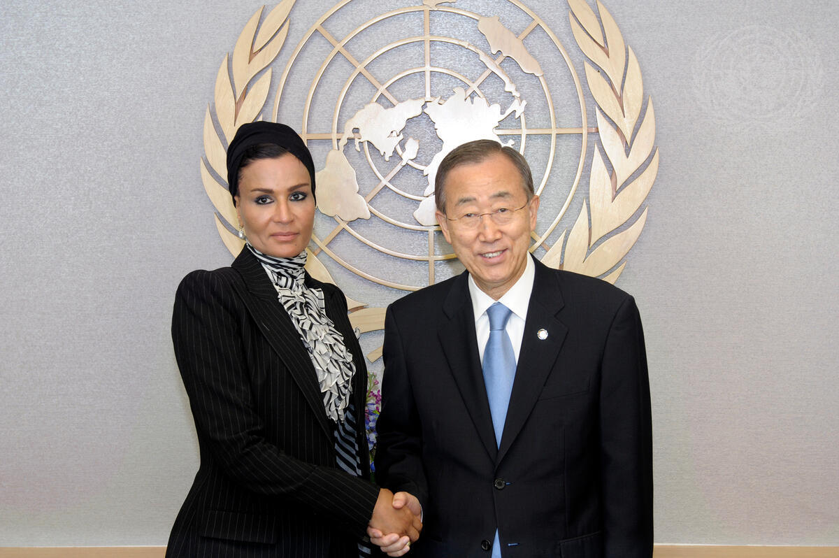Secretary-General Ban Ki-moon (right) meets with Sheikha Mozah bint Nasser Al Missned of Qatar, Chairperson of the Qatar Foundation for Education, Science and Community Development and Member of the UN Millennium Development Goals Advocacy Group.