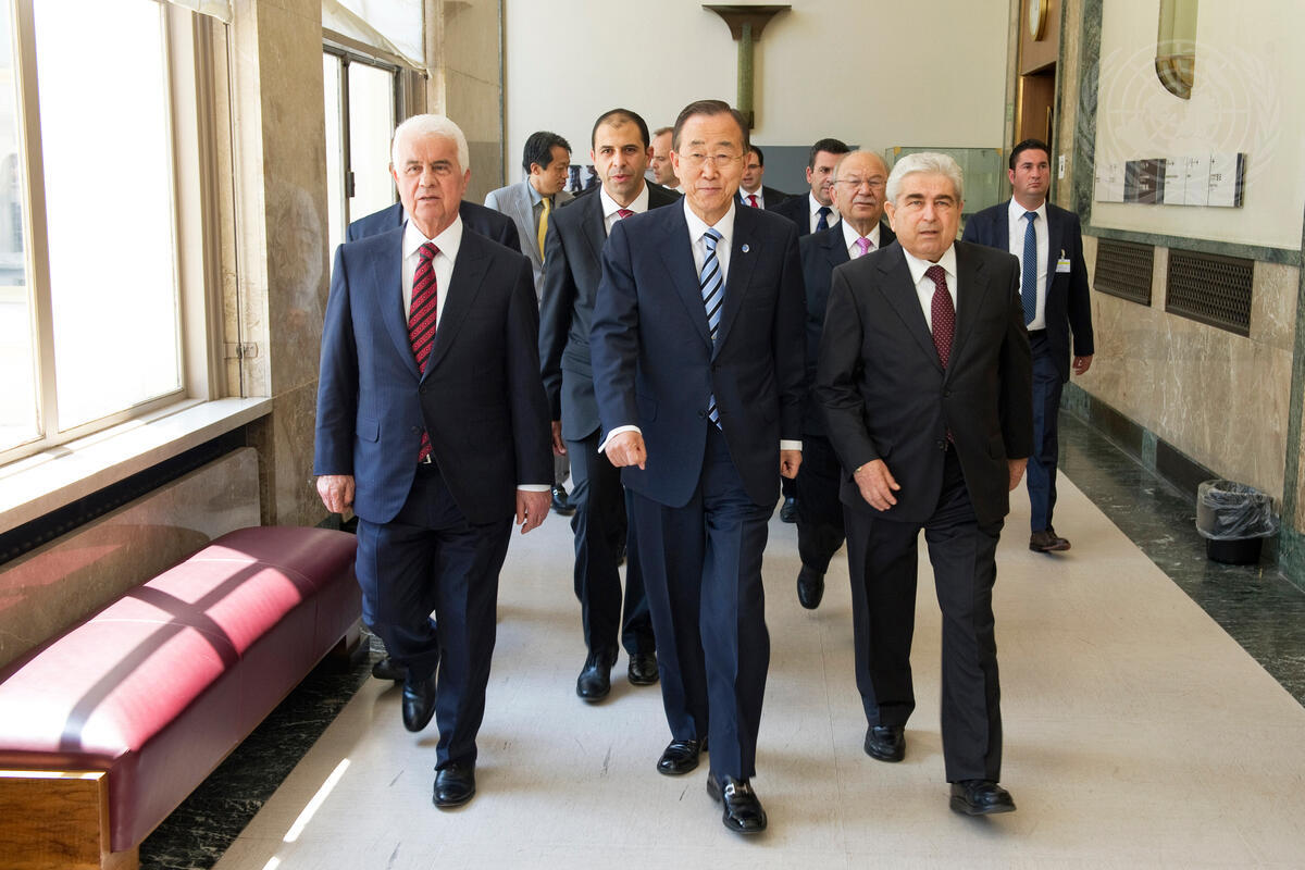 Secretary-General Ban Ki-moon (centre); Demetris Christofias (right), President of the Republic of Cyprus; and Dervis Eroglu (left), Turkish-Cypriot Leader; proceed to the venue of the Cyprus Talks.