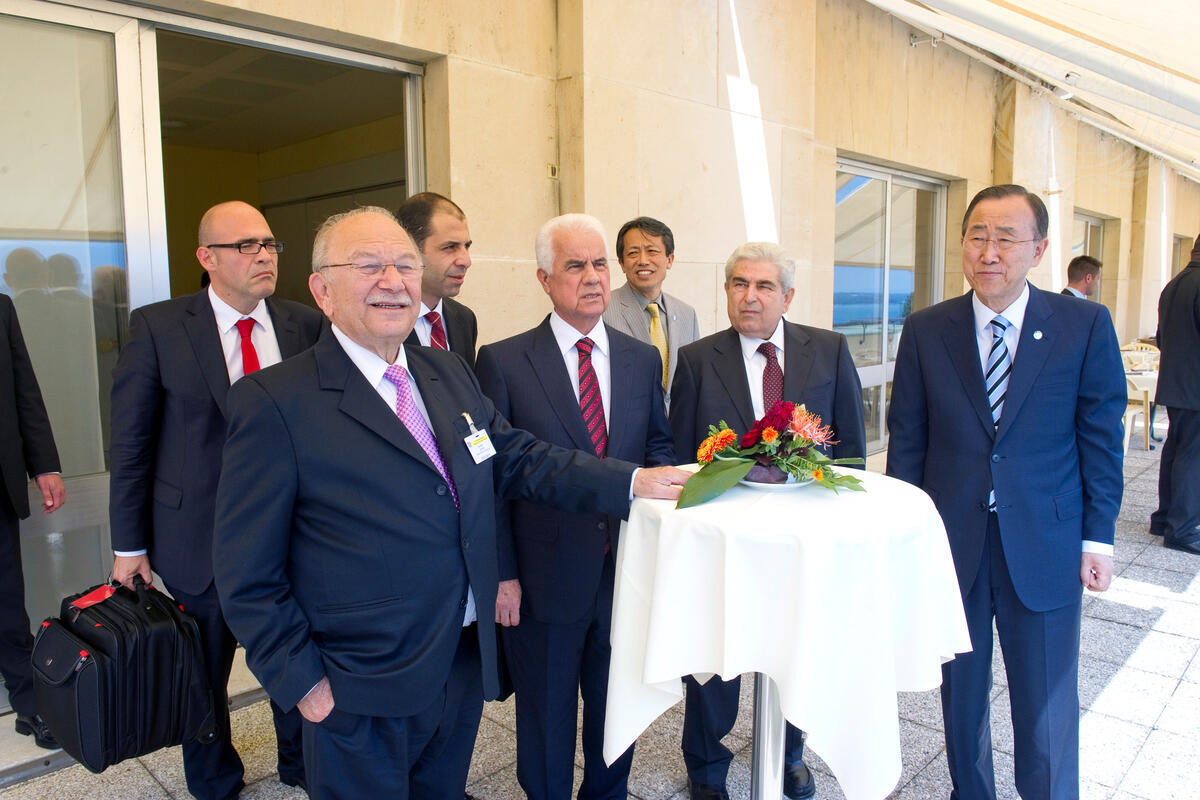 Secretary-General Ban Ki-moon (right); Demetris Christofias (third from left), President of the Republic of Cyprus; and Dervis Eroglu (second from left), Turkish-Cypriot Leader; and others pose for a group photograph during the Cyprus Talks.