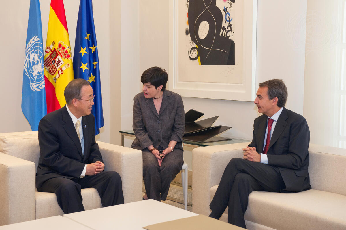 Secretary-General Ban Ki-moon (left) meets with José Luis Rodríguez Zapatero (right), Prime Minister of Spain. An interpreter is also pictured.