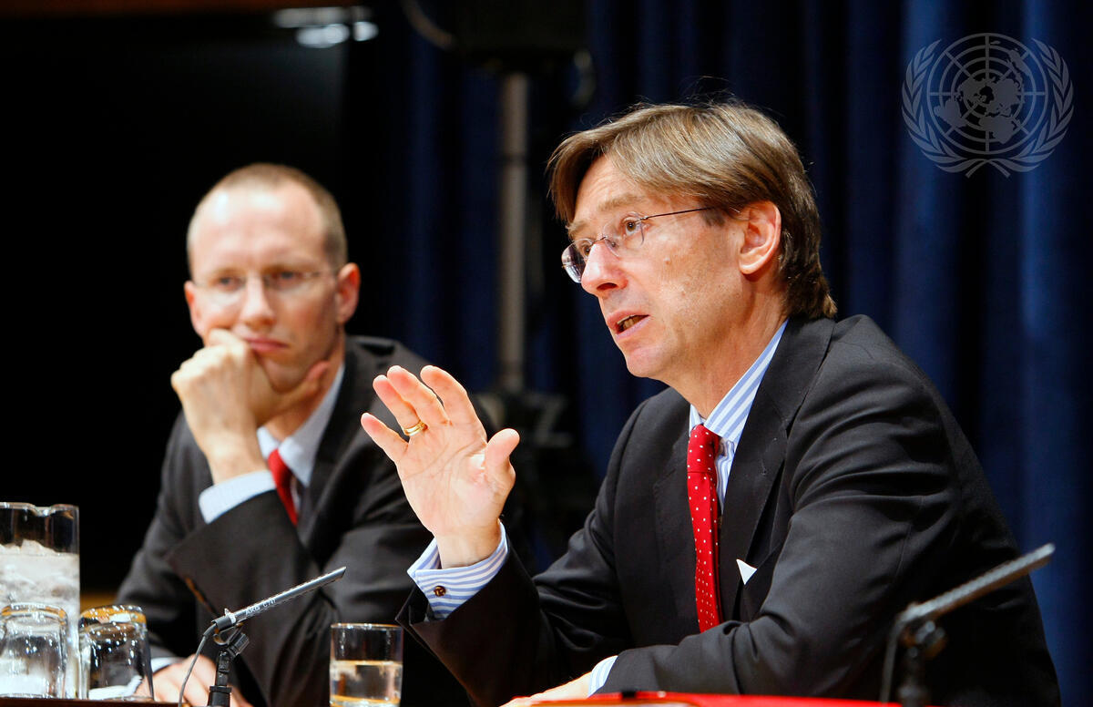 Peter Wittig (right), President of the Security Council for the month of July 2011 and Permanent Representative of Germany to the United Nations, briefs journalists on the Council's programme of work for the month.