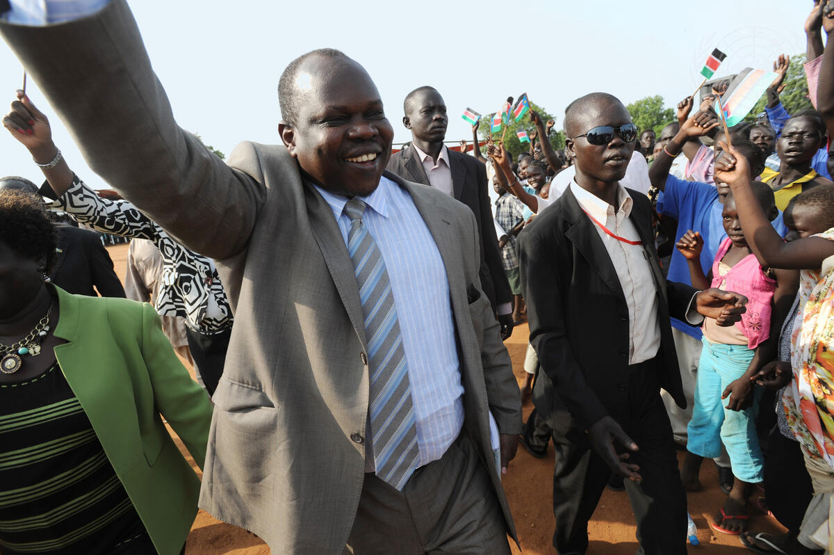 Pagan Amum, Secretary-General of Sudan People's Liberation Movement (SPLM), waves to participants of the rally in Juba, on the eve of South Sudan's independence.