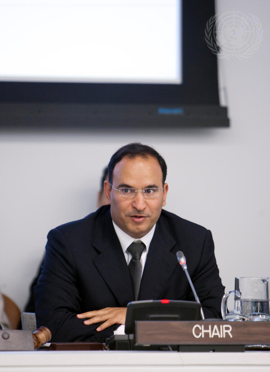 Mansour Ayyad SH A Alotaibi, Chair of the Group of Asian States and Permanent Representative of the State of Kuwait to the UN, speaks at a meeting of the Group with Secretary-General Ban Ki-moon and others.