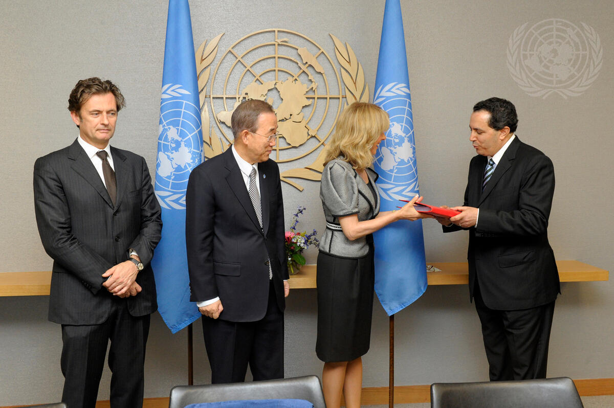 Ghazi Jomaa (right), Permanent Representative of Tunisia to the UN, presents a document symbolizing his country’s accession to the Rome Statute of the International Criminal Court (ICC), to Patricia O’Brien, Under-Secretary-General for Legal Affairs. With them: Christian Wenaweser (left), President of the Assembly of States Parties to the ICC, and Secretary-General Ban Ki-moon.