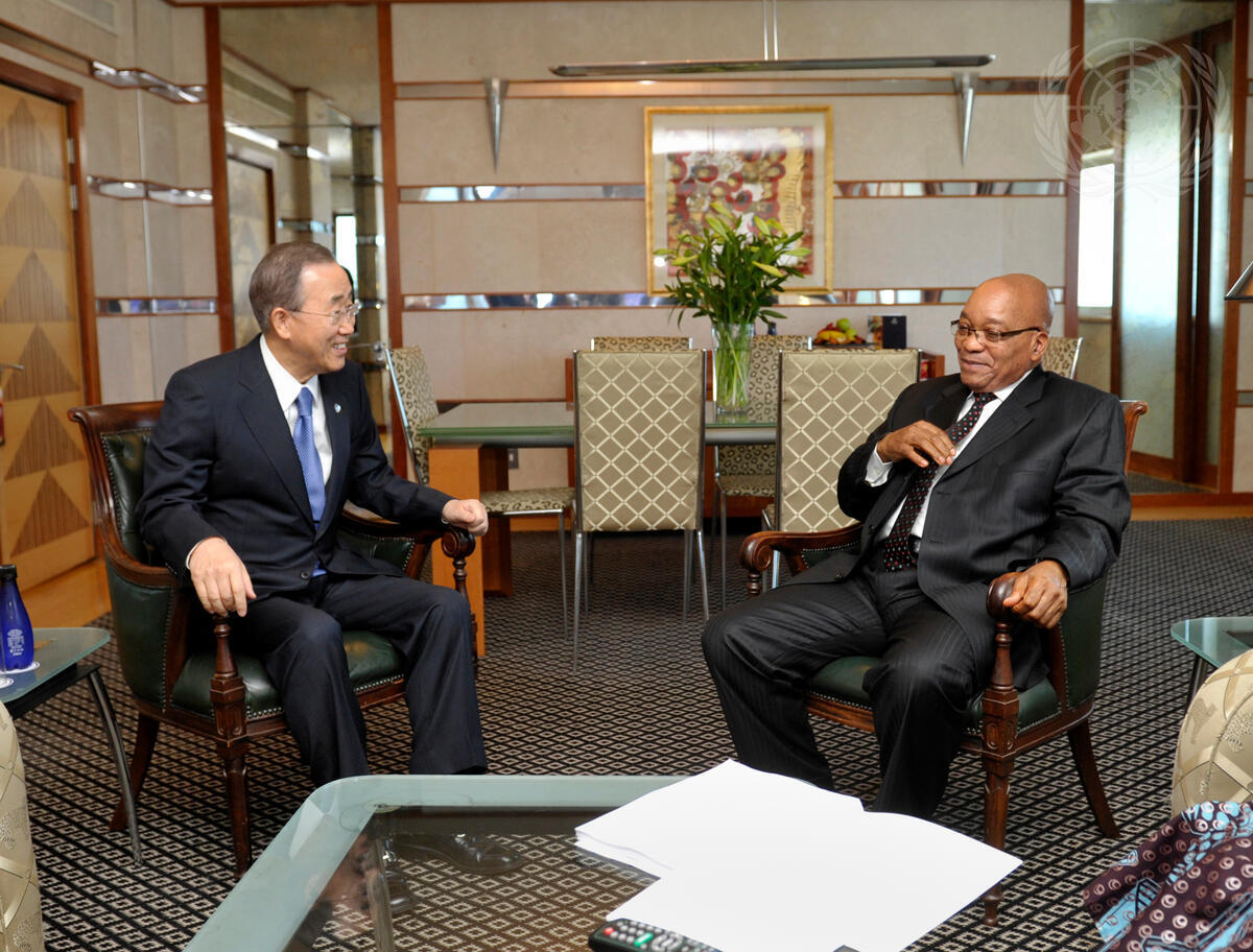 Secretary-General Ban Ki-moon (left) meets with Jacob Zuma, President of the Republic of South Africa, on the sidelines of the COP17/CMP7 UN Climate Change Conference in Durban.